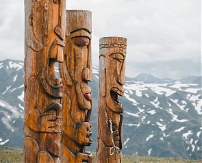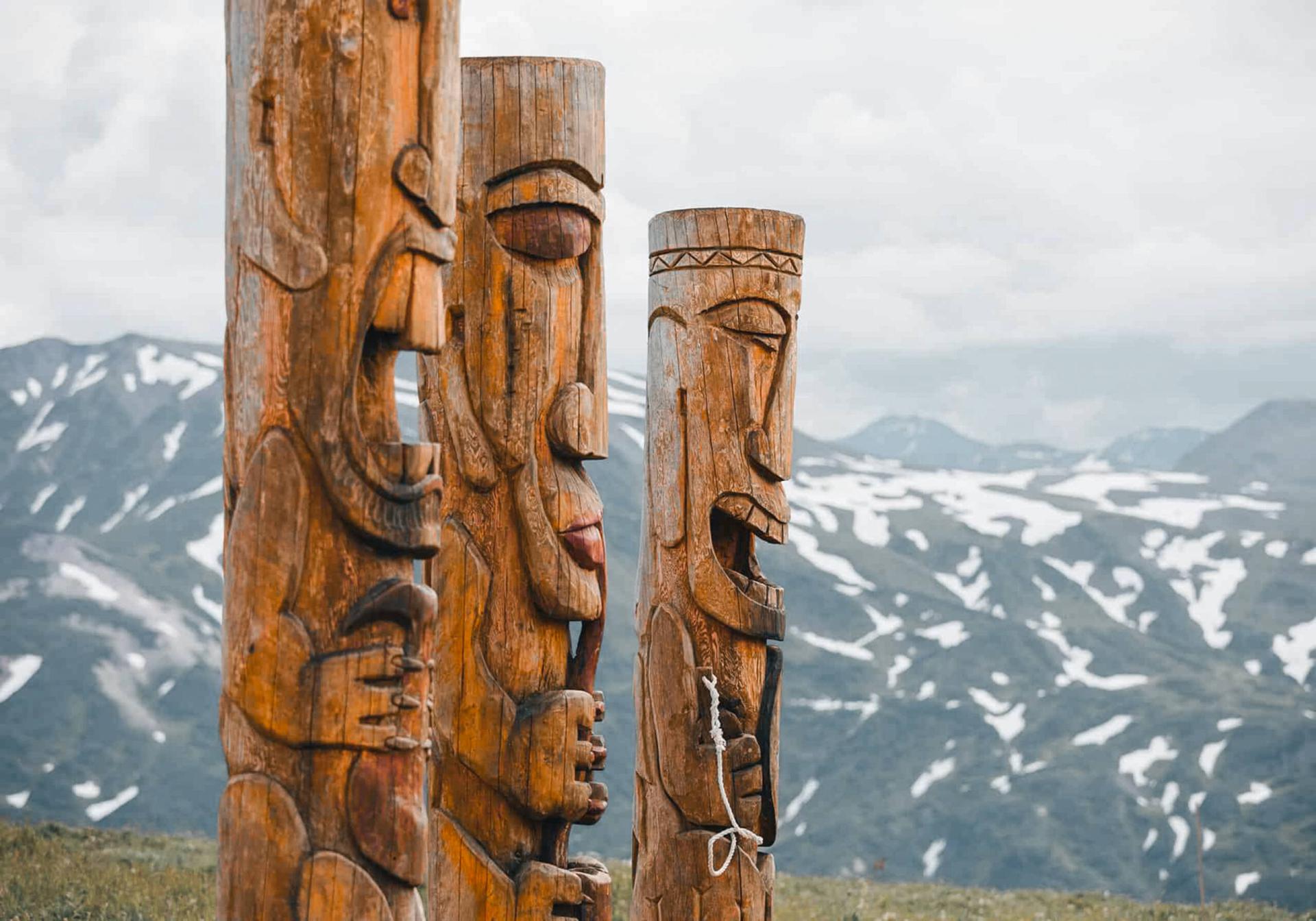 Как раз такие столбы-обереги стоят на Вилючинском перевале, привлекая массу туристов своими выражениями лиц. Один из них держит курительную трубку – символ дыма и вулкана. Второй держит кита – добычу или символ изобилия. Третий держит бубен – инструмент для общения с миром духов. Однако стоит отметить, что это не историческое наследие, а новодел, установленный властями полуострова.
