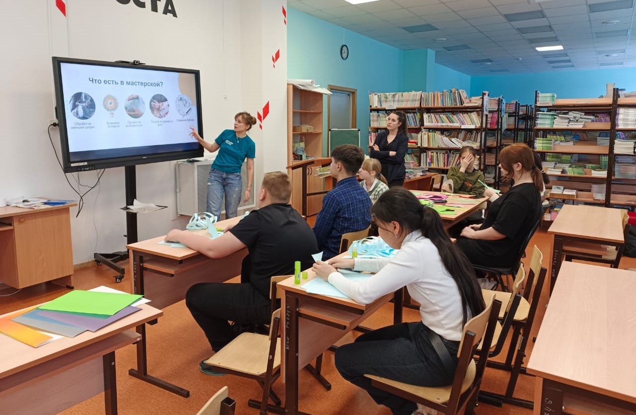 Специалисты мастерской посетили Быстринскую школу. Они рассказали учащимся 5-7 классов о мастер-классах, на которых ребята смогут: изготовить бубен, освоить резьбу по дереву и многое другое!
