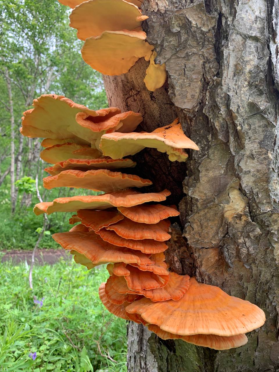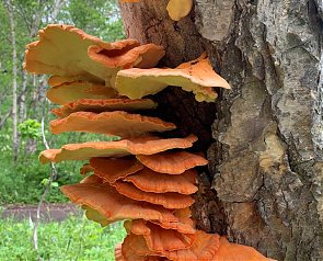 Огненный трутовик также называют - ведьмина сера, куриный гриб и древесный цыпленок.